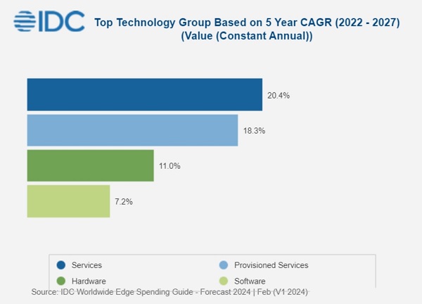 最大的投資份額將繼續(xù)由硬件(Hardware)主導(dǎo),接近總支出的40%,以建立邊緣能力,特別是由服務(wù)提供商基礎(chǔ)設(shè)施驅(qū)動(dòng)。硬件支出將由對(duì)邊緣網(wǎng)關(guān)、服務(wù)器和網(wǎng)絡(luò)設(shè)備的投資推動(dòng)。在預(yù)測(cè)期內(nèi),企業(yè)對(duì)Provisioned Services的采用率將激增,到2026年將首次超過(guò)硬件份額。在Provisioned Services中,Connectivity和IaaS將分別代表最大份額和增長(zhǎng)最快的類別。On-premise software將是邊緣基礎(chǔ)設(shè)施的關(guān)鍵組成部分,但在總體支出方面仍然是最小的類別。