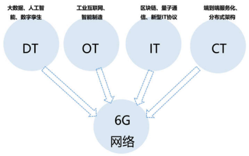 更多的來(lái)自生產(chǎn)運(yùn)營(yíng)的需求和技術(shù)OT (Operation Technology) 將為移動(dòng)網(wǎng)帶來(lái)新的基因。與傳統(tǒng)消費(fèi)互聯(lián)網(wǎng)不同,產(chǎn)業(yè)互聯(lián)網(wǎng)對(duì)網(wǎng)絡(luò)質(zhì)量提出嚴(yán)苛需求,網(wǎng)絡(luò)在追求大帶寬、低時(shí)延的同時(shí)也要支持確定性傳輸、可保障、可控制的連接數(shù)以及可保障帶寬,從而滿足柔性制造、智能產(chǎn)線的要求。無(wú)線接入網(wǎng)絡(luò)需要具備媲美有線接入的可靠性、可用性、確定性和實(shí)時(shí)性。OT與CT融合將成為未來(lái)6G發(fā)展的一個(gè)重要方向,通信網(wǎng)絡(luò)將成為構(gòu)建工業(yè)環(huán)境下人、機(jī)、物全面互聯(lián)的關(guān)鍵基礎(chǔ)設(shè)施,實(shí)現(xiàn)工業(yè)設(shè)計(jì)、研發(fā)、生產(chǎn)、管理、服務(wù)等產(chǎn)業(yè)全要素的泛在互聯(lián),是制造業(yè)數(shù)字化轉(zhuǎn)型的重要推動(dòng)力。從DICT向DOICT(Data、Operation、Information、Communication Technology)的融合將成為6G的趨勢(shì)。