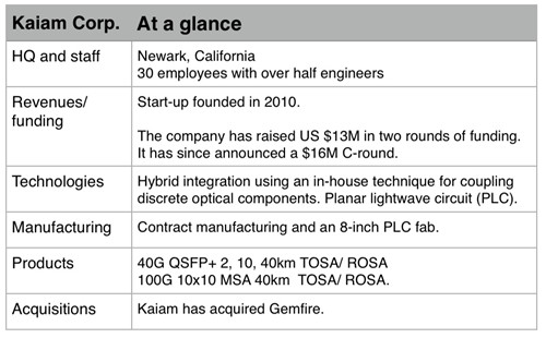 通過收購,Kaiam獲得PLC技術和Gemfire在蘇格蘭的8寸晶圓廠。考慮到目前PLC技術獨立的供應商已經(jīng)不多了,因此這一開始還是很重要的。與Oplink合作,Kaiam最近也展示了100 Gigabit 10x10 MSA 40km CFP模塊。