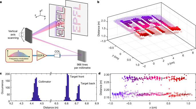 由于該“孤子微梳”可以提供99GHz的超短相干光脈沖,如圖2所示,Tobias J. Kippenberg團(tuán)隊利用“孤子微梳”搭建多達(dá)30條相互獨立的FMCWLiDAR通道,每條通道都可實現(xiàn)對目標(biāo)的測距和測速,從而每秒3兆像素的距離和速度測量,并還有望將采樣速率提高到每秒150兆像素以上。