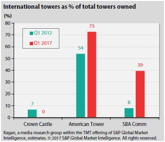 事實(shí)上,加上對(duì)Lightower的收購(gòu),Crown Castle這一系列激進(jìn)行為都意在支持對(duì)Small Cell連接的日益增長(zhǎng)的需求,但其主要競(jìng)爭(zhēng)對(duì)手如SBA通訊集團(tuán)和美國(guó)鐵塔公司進(jìn)入Small Cell市場(chǎng)的方式或許更加精妙。SBA和美國(guó)鐵塔開(kāi)拓國(guó)外市場(chǎng)進(jìn)展順利,當(dāng)Crown Castle剝離澳洲鐵塔并使其100%資產(chǎn)在美國(guó)時(shí),SBA國(guó)際鐵塔占總鐵塔數(shù)的比例卻從2012年Q1的8%上升到2017年Q1的39%,美國(guó)鐵塔該數(shù)字同期也從54%上升到73%。