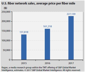 Kagan認(rèn)為在2015年-2017年間,平均每英里的光纖網(wǎng)絡(luò)價(jià)格年復(fù)合增長(zhǎng)率達(dá)31%,其中2015年的價(jià)格是13萬(wàn)美元,而2017年的價(jià)格在經(jīng)歷兩大交易后達(dá)到22.7萬(wàn)美元。Kagan分析了7個(gè)同類(lèi)型交易案例,平均交易價(jià)格為每英里16.8萬(wàn)美元,而Crown Castle堪稱(chēng)是光纖網(wǎng)絡(luò)最大“求婚者”,在這7個(gè)同類(lèi)交易中占據(jù)了4個(gè)。