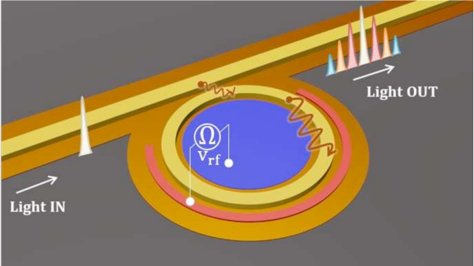 上圖是微環(huán)調制器(MRM)示意圖,顯示單頻光輸入經過調制獲得一系列邊帶光輸出。