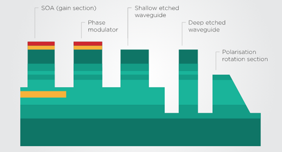 圖3:PIC芯片上的器件的簡(jiǎn)化例子及其所需的不同材料層。資料來(lái)源:Smit等人 (2014)