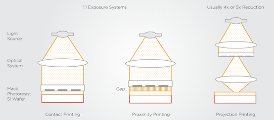 圖4:不同光學(xué)光刻方法的比較。接觸式和接近式印刷使光罩與樣品接觸或接近。投影光刻式使光罩保持在較遠(yuǎn)的地方,最初的成本較高,但它是大批量制造的首選技術(shù)。資料來(lái)源:滑鐵盧大學(xué)J: J. Shen, 滑鐵盧大學(xué)博士論文 (2018)