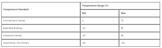 表1:比較不同溫度硬化標(biāo)準(zhǔn)的溫度范圍,包括工業(yè)、汽車(chē)以及全面軍事應(yīng)用