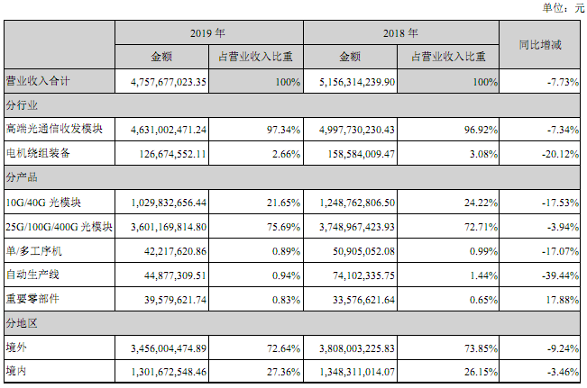 分產(chǎn)品來(lái)看,10G/40G光模塊營(yíng)收約10.30億元,同比下降17.53%,占總營(yíng)收21.65%;25G/100G/400G光模塊營(yíng)收36.01億元,同比下降3.94%,占總營(yíng)收75.69%。兩項(xiàng)產(chǎn)品(即高端光通信收發(fā)模塊)合計(jì)營(yíng)收46.31億元,同比下降7.34%,占總營(yíng)收97.34%。國(guó)內(nèi)外市場(chǎng)營(yíng)收占比分別為72.64%和27.36%。