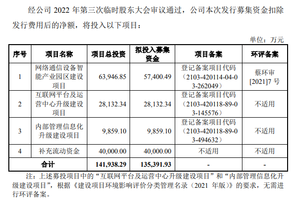 本次發(fā)行股票擬募集資金13.54億元,用于網(wǎng)絡(luò)通信設(shè)備智能產(chǎn)業(yè)園區(qū)建設(shè)項(xiàng)目、互聯(lián)網(wǎng)平臺(tái)及運(yùn)營(yíng)中心升級(jí)建設(shè)項(xiàng)目、內(nèi)部管理信息化升級(jí)建設(shè)項(xiàng)目和補(bǔ)充流動(dòng)資金。本次募集資金投資項(xiàng)目具有明確的投資方向,全部用于主營(yíng)業(yè)務(wù)相關(guān)領(lǐng)域,與公司現(xiàn)有業(yè)務(wù)、核心技術(shù)具有緊密的關(guān)系,是公司持續(xù)提升核心競(jìng)爭(zhēng)力、完成戰(zhàn)略布局、實(shí)現(xiàn)長(zhǎng)期可持續(xù)發(fā)展的重要途徑。
