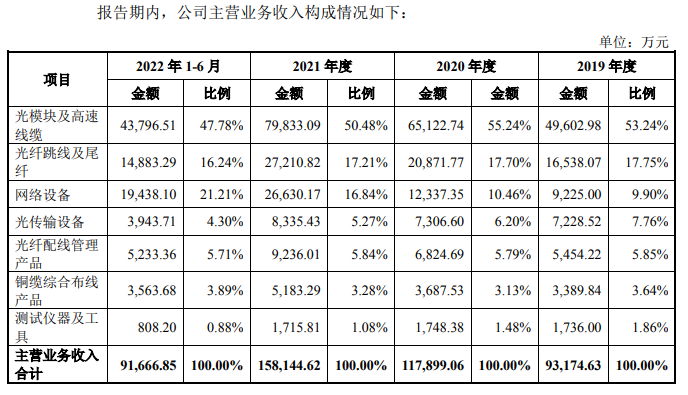飛速創(chuàng)新已開(kāi)發(fā)超過(guò)7萬(wàn)個(gè)SKU 的核心設(shè)備及通用配件,主要產(chǎn)品包括光模塊及高速線纜、光纖跳線及尾纖、網(wǎng)絡(luò)設(shè)備、光傳輸設(shè)備、光纖配線管理產(chǎn)品、銅纜綜合布線產(chǎn)品、測(cè)試儀器及工具。光模塊產(chǎn)品主要分為100/200/400/800G光模塊系列、25/40/50G光模塊系列、10/16/32G光模塊系列和100M/1G/2G/2.5G/4G光模塊系列。其中光模塊及高速線纜的營(yíng)收占比最大,報(bào)告期內(nèi)營(yíng)收占比分別為53.24%、55.24%、50.48%和47.78%。