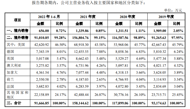 飛速創(chuàng)新2019 年度、2020 年度、2021 年度和 2022 年 1-6 月?tīng)I(yíng)業(yè)收入分別為93,174.63萬(wàn)元、117,956.42 萬(wàn)元、158,202.67萬(wàn)元和91,677.16萬(wàn)元。飛速創(chuàng)新的收入主要來(lái)自境外,公司境外業(yè)務(wù)覆蓋全球多個(gè)國(guó)家和地區(qū)。2019-2022年上半年,公司境外銷(xiāo)售占飛速創(chuàng)新主營(yíng)業(yè)務(wù)收入的比例分別為97.95%、98.89%、99.15%和99.28%。其中,美國(guó)為主要收入來(lái)源,銷(xiāo)售額占該公司主營(yíng)業(yè)務(wù)收入的比重分別為45.79%、45.77%、43.58%和46.50%。