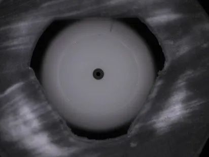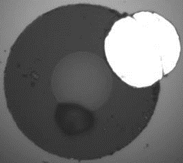 而端面的微小顆粒,在連接中可能會承受巨大壓力而被碾碎。下圖中白色圓盤實際上是在連接建立時被壓碎的球形鋼粉顆粒。在這種情況下,球形鋼粉顆粒的強度足以損壞光纖內(nèi)部的玻璃成分。