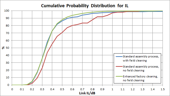 我們采用多種清潔方法,對大量多模光纖鏈路上的插入損耗(IL)進行了測試。結(jié)果充分表明,從插入損耗分布和插入損耗故障次數(shù)來看,采用經(jīng)過優(yōu)化后清潔流程處理的產(chǎn)品以及因裝配防塵罩而無需進一步清潔的產(chǎn)品(“在數(shù)據(jù)中心無需清潔”的情況)在性能上可媲美或者優(yōu)于“現(xiàn)場”清潔的產(chǎn)品。