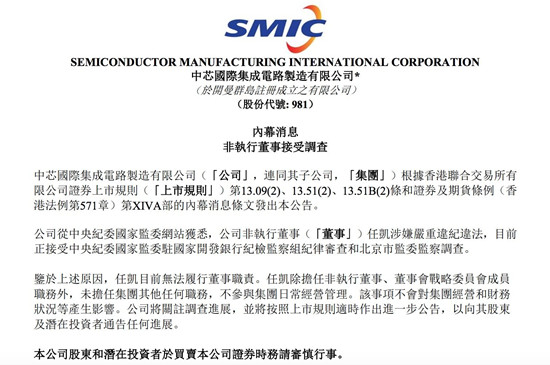 ICC訊 9月19日消息,中芯國際在港交所發(fā)布公告,公司從中央紀(jì)委國家監(jiān)委網(wǎng)站獲悉,公司非執(zhí)行董事任凱涉嫌嚴(yán)重違紀(jì)違法,目前正接受中央紀(jì)委國家監(jiān)委駐國家開發(fā)銀行紀(jì)檢監(jiān)察組紀(jì)律審查和北京市監(jiān)委監(jiān)察調(diào)查。