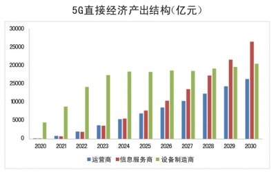 從產(chǎn)出結(jié)構(gòu)看,拉動產(chǎn)出增長的動力隨5G商用進(jìn)程的深化而相繼轉(zhuǎn)換。在5G商用初期,運(yùn)營商大規(guī)模開展網(wǎng)絡(luò)建設(shè),5G網(wǎng)絡(luò)設(shè)備投資帶來的設(shè)備制造商收入將成為5G直接經(jīng)濟(jì)產(chǎn)出的主要來源,預(yù)計(jì)2020年,網(wǎng)絡(luò)設(shè)備和終端設(shè)備收入合計(jì)約4500億元,占直接經(jīng)濟(jì)總產(chǎn)出的94%。在5G商用中期,來自用戶和其他行業(yè)的終端設(shè)備支出和電信服務(wù)支出持續(xù)增長,預(yù)計(jì)到2025年,上述兩項(xiàng)支出分別為1.4萬億和0.7萬億元,占到直接經(jīng)濟(jì)總產(chǎn)出的64%。在5G商用中后期,互聯(lián)網(wǎng)企業(yè)與5G相關(guān)的信息服務(wù)收入增長顯著,成為直接產(chǎn)出的主要來源,預(yù)計(jì)2030年,互聯(lián)網(wǎng)信息服務(wù)收入達(dá)到2.6萬億元,占直接經(jīng)濟(jì)總產(chǎn)出的42%。