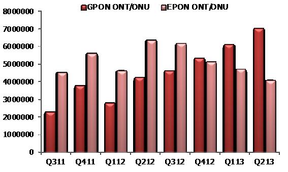 對于ODN市場來說有些問題需要注意,同樣對于處在ODN兩頭的PON市場的變化,也應(yīng)引起重視。對于PON我們來看兩個圖表,關(guān)于目前全球PON市場的出貨量情況。