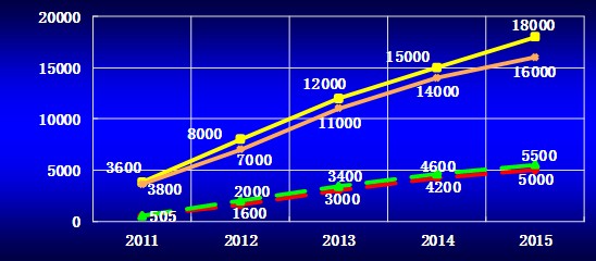 從圖二發(fā)展趨勢可得出,中國FTTH的覆蓋數(shù)從2013年到2015年將增長45%-50%,而實際用戶數(shù)從2013年到2015年將增長60%-66%。如果按平均每戶3個人使用,則到2015年中國的FTTH覆蓋將達(dá)4.8-5.4億人;實際使用人數(shù)為1.5-1.65億人。