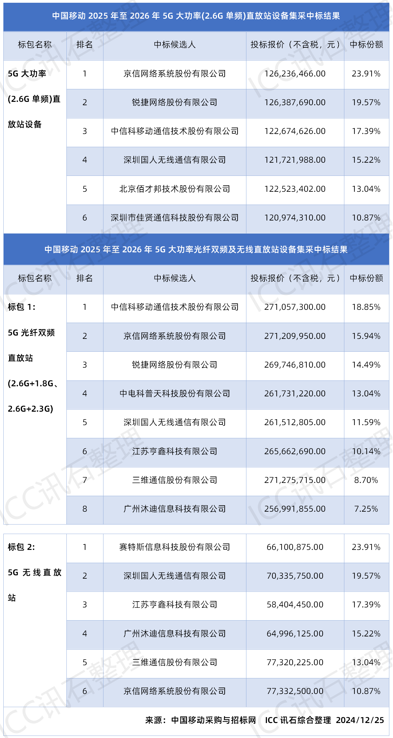 ICC訊 近期,中國移動(dòng)于采購與招標(biāo)網(wǎng)公示了“中國移動(dòng)2025年至2026年5G大功率光纖雙頻及無線直放站設(shè)備集中采購項(xiàng)目”與“中國移動(dòng)2025年至2026年5G大功率(2.6G單頻)直放站設(shè)備集中采購項(xiàng)目”的采購結(jié)果,本次兩大集采項(xiàng)目共有11家廠商中標(biāo)。