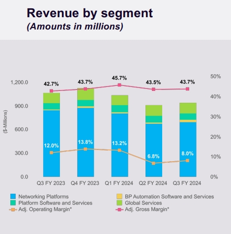 分業(yè)務(wù)部門來看,2024財(cái)年第三季度,來自網(wǎng)絡(luò)平臺(tái)的銷售收入為6.995億美元,同比下滑17.38%,來自平臺(tái)軟件和服務(wù)的銷售收入為8320萬美元,與去年同期的7890萬美元同比增長(zhǎng)5.45%,來自全球服務(wù)的銷售收入為1.34億美元,同比增長(zhǎng)3.48%。