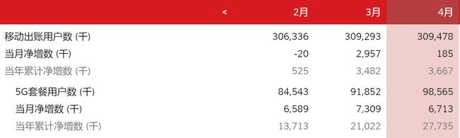 截至4月底,中國聯(lián)通移動用戶總數(shù)為3.09478億戶,本月凈增長18.5萬戶,全年累計增長366.7萬戶。其中5G套餐用戶總數(shù)為0.98585億戶,本月凈增長671.3萬戶,全年累計增長2773.5萬戶。