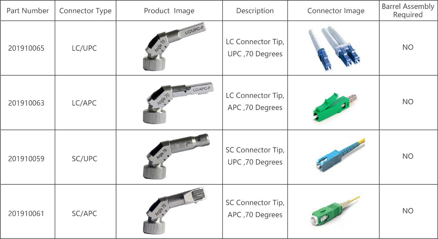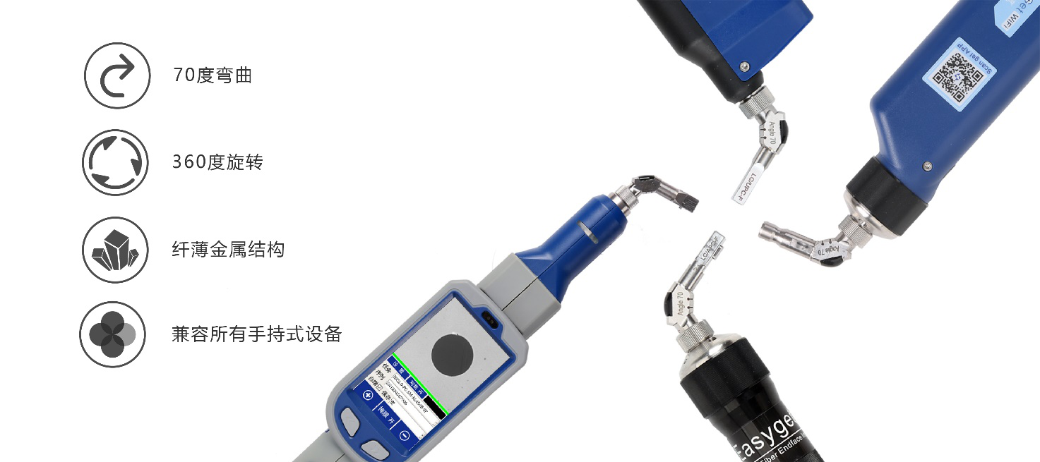 Dimension的70度彎曲接頭和現(xiàn)有的手持式端面檢測儀EASYGET,EASYGET WIFI,AUTOGET,AUTOGET WIFI實(shí)現(xiàn)了全面兼容,拓展了應(yīng)用范圍。客戶可根據(jù)自己的需要選用合適的彎曲接頭,輕松完成特殊結(jié)構(gòu)或應(yīng)用場景下光纖端面的檢測與分析。