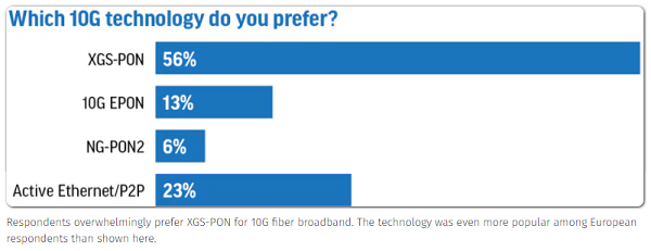熟悉公司10G計劃的受訪者表達了對XGS-PON技術(shù)的強烈偏好。超過56%的人選擇了XGS-PON,相比之下,有源以太網(wǎng)或其他形式的點對點技術(shù)為22.7%,10G-EPON為13.4%,NG-PON2為5.8%。