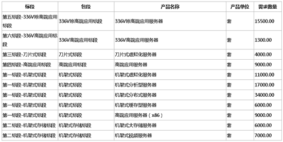 本次集采共分為五個標段,分別為機架式標段(虛擬化服務器、分析型服務器、分布式服務器、緩存性服務器、高端應用服務器),機架式存儲標段(大存儲服務器、視頻服務器),刀片式標段,高端應用標段,336V高端應用標段以及336V除高端應用標段。
