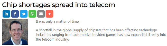 ICC訊(編譯:Nina)日前,Light Reading 5G和移動(dòng)策略編輯總監(jiān)Mike Dano發(fā)文表示,全球芯片組供應(yīng)不足一直影響著汽車到視頻游戲等科技行業(yè),如今已直接擴(kuò)展到電信行業(yè)。