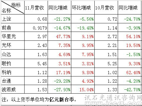 如上圖,華星光、光環(huán)依然同環(huán)比均漲,今年下半年以來(lái),華星光、光環(huán)不受大環(huán)境影響,依舊漲勢(shì)喜人。光環(huán)11月營(yíng)收2.4億元,環(huán)比增長(zhǎng)10%,同比增長(zhǎng)7.3%。華星光通11月營(yíng)收2.9億元,環(huán)比增長(zhǎng)9%,同比增長(zhǎng)47.7%,為歷史新高。而上詮、前鼎、臺(tái)通、波若威等無(wú)源廠商則不太樂(lè)觀。