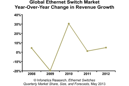 【訊石光通訊咨詢網(wǎng)】由于受到季節(jié)性因素的影響,2013Q1以太網(wǎng)交換機銷售額下滑,但從過去的三個季度來看,整體上還是有所增長,考慮到歐洲的持續(xù)疲軟和美國聯(lián)邦政府開支的降低,這還是一個積極的信號