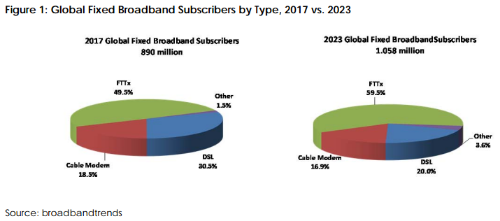 ICCSZ訊(編譯:Nina)Broadbandtrends(BBT)預(yù)測(cè),全球固網(wǎng)寬帶用戶將從2017年底的8.9億增長(zhǎng)到2023年底的10.58億,年復(fù)合增長(zhǎng)率為2.9%;全球?qū)拵占奥?Penetration of households)將從2017年底的47.5%上升至2023年的52.6%。