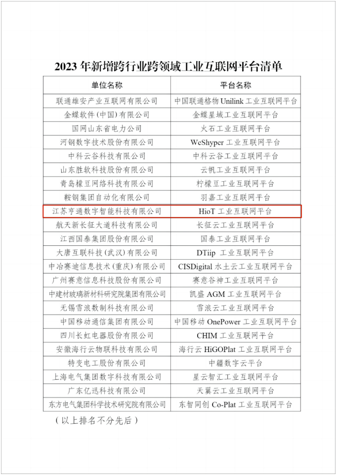 8月1日,工信部公示了2023年新增跨行業(yè)跨領(lǐng)域工業(yè)互聯(lián)網(wǎng)平臺清單,江蘇亨通數(shù)字智能科技有限公司(簡稱“亨通數(shù)科”)打造的HioT工業(yè)互聯(lián)網(wǎng)平臺成功入選。