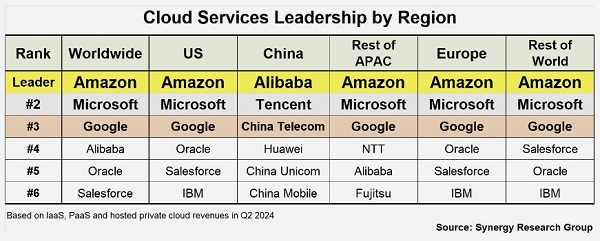 ICC訊 Synergy Research Group最新發(fā)布的第二季度數(shù)據(jù)顯示,按季度收入計算,亞馬遜(Amazon)、微軟(Microsoft)和谷歌(Google)顯然是全球云市場的領(lǐng)導(dǎo)者。它們的市場份額分別為32%、23%和12%,而其他公司的市場份額都沒有超過4%。在這三家公司之后,前六名分別是阿里巴巴、甲骨文(Oracle)和Salesforce。撇開中國不談,所有主要地區(qū)——美國、亞太地區(qū)其他地區(qū)、歐洲和世界其他地區(qū)--的前三大云提供商排名都是一樣的。在前三名之外,各地區(qū)的排名確實略有變化,通常爭奪位置的包括甲骨文、Salesforce、IBM和NTT。然而,前三名排名的共性表明了云市場真正的全球性。要成為市場領(lǐng)導(dǎo)者,需要龐大的規(guī)模、雄厚的資金、不斷的技術(shù)創(chuàng)新、全球品牌、超大規(guī)?;A(chǔ)設(shè)施的全球網(wǎng)絡(luò),以及長期的企業(yè)承諾和專注。對于任何想要挑戰(zhàn)云計算領(lǐng)導(dǎo)者的人來說,這都是主要的障礙。