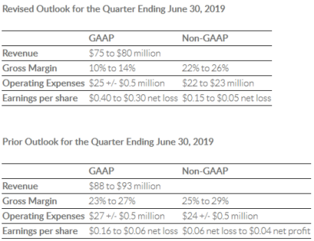 考慮到這些行動,NeoPhotonics更新了其對截至2019年6月30日的季度展望。公司預計,銷售收入將在7500-8000萬美元之間,低于之前預期的8800-9300萬美元之間,GAAP毛利率將在10%-14%,低于之前預期的23%-27%,非GAAP毛利率將在22%-26%,低于之前預期的25%-29%,GAAP每股攤薄虧損30-40美分之間,之前預期6-16美分之間,非GAAP每股攤薄虧損5-15美分之間,之前預期虧損6美分至盈利4美分之間。