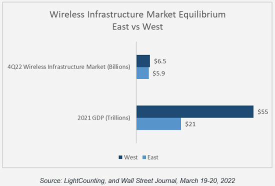 與此同時(shí),無線基礎(chǔ)設(shè)施市場繼續(xù)在2021達(dá)到的平衡狀態(tài)下運(yùn)行:兩個(gè)相對的勢力范圍,即中國領(lǐng)導(dǎo)的東方和美國及其盟友定義的西方,正變得更加平衡。LC發(fā)現(xiàn),西方占據(jù)了全球無線基礎(chǔ)設(shè)施市場的52%,而東方占據(jù)了其余的份額,其中中國占了東方的80%以上。