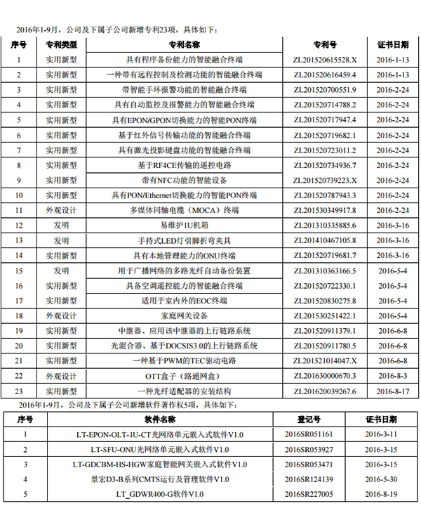 今年省網(wǎng)整合給路通視信帶來發(fā)展機遇,公司借此入圍全國23個省網(wǎng)招標項目,打造較為顯著的市場優(yōu)勢和品牌影響力。專利方面,今年以來路通視信一共獲得授權專利23項,其中發(fā)明專利3 項、實用新型專利17項、外觀設計專利3項,獲得軟件著作權5項,涉及PON和光通訊的專利為8項。