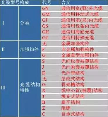 光纜型號由光纜型式的代號和規(guī)格的代號構(gòu)成,中間用一空格隔開。