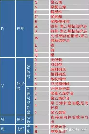 光纜的型式由五個部分組成,如下所示。各部分均用代號表示。