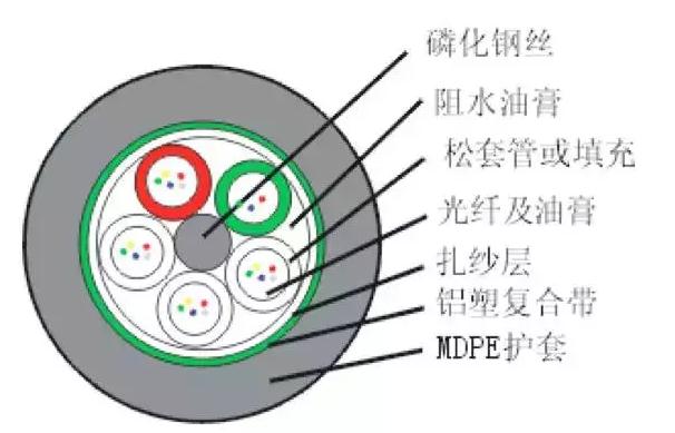 GYTA光纜的結(jié)構(gòu)是將單?;蚨嗄9饫w套入由高模量的塑料做成的松套管中,套管內(nèi)填充阻水化合物。 纜芯的中心是一根金屬加強(qiáng)芯,對于某些芯數(shù)的光纜來說,金屬加強(qiáng)芯外還需擠上一層聚乙烯,松套管(和填充繩)圍繞中心加強(qiáng)芯絞合成緊湊和圓形的纜芯,纜芯內(nèi)的縫隙充以阻水填充物。涂塑鋁帶(APL)縱包后聚乙烯外護(hù)套成纜。