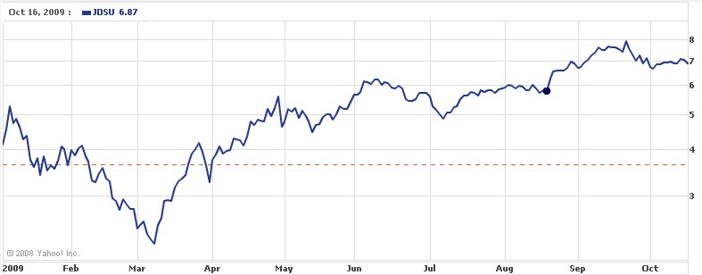 摘要:JDSU公司近日宣布將于近期舉行2009年度股東大會(huì),具體時(shí)間為美國西部時(shí)間11月11日上午九點(diǎn)。這家數(shù)據(jù)網(wǎng)通設(shè)備制造商過去1個(gè)月股價(jià)小跌,但是今年來大漲87%。