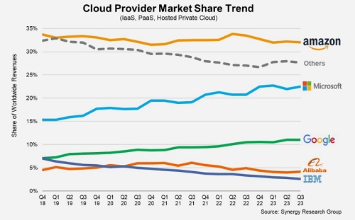 雖然大數(shù)定律繼續(xù)對云市場增長率施加下行壓力,但人工智能正在進一步推動市場。在人工智能的幫助下,有跡象表明,許多企業(yè)正經(jīng)歷勒緊褲腰帶、選擇優(yōu)化而非增長云計算業(yè)務(wù)的時期。人工智能正在幫助開發(fā)各種新的云工作負載。在經(jīng)歷了長時間的云運營限制后,龐大的中國市場也在逐步回歸更正常的增長模式。Synergy充分預(yù)計未來幾年的云增長率將保持強勁。