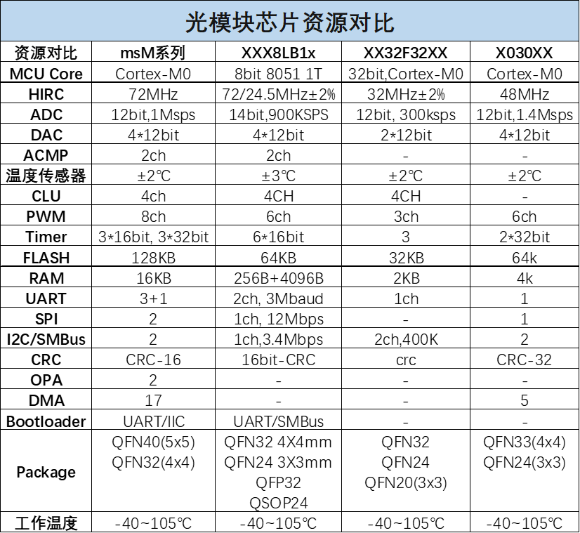 ICC訊 5G時代的到來,光模塊在日常生活中的普及程度越來越高,常見智能電網(wǎng)、5G基站、安防監(jiān)控、光纖路由器等都是基于光模塊來進行通訊的。光模塊中對負責底層DDM模擬量監(jiān)控的MCU要求極為嚴格,數(shù)據(jù)的傳輸速率僅僅是快和精準是無法滿足要求的,需要更高抗干擾性和穩(wěn)定性。