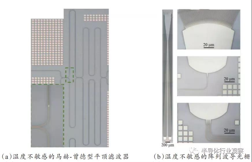 硅材料熱光系數(shù)大的特點導(dǎo)致硅基光波導(dǎo)系統(tǒng)對周圍溫度環(huán)境的變化極為敏感,這對諸如硅基片上波分復(fù)用系統(tǒng)的工作波長將造成極大的影響,通常需要額外的溫控管理來穩(wěn)定工作狀態(tài)。如圖(4d)所示,利用非對稱MMI實現(xiàn)的任意分束比1×2光功率分束器能夠作為片上監(jiān)測單元為控制系統(tǒng)提供反饋。為降低溫控額外引入的能耗,可以通過設(shè)計溫度不敏感的片上濾波器來實現(xiàn)。北京大學(xué)周治平課題組[32-34]針對常見的3種溫度不敏感濾波器都進行了研究,包括微環(huán)型、馬赫-曾德干涉型和陣列波導(dǎo)光柵型。微環(huán)型濾波器可以利用雙環(huán)耦合諧振譜分裂的現(xiàn)象來抵消熱光效應(yīng)引起的波長漂移,避免使用與CMOS工藝不兼容的負(fù)熱光系數(shù)材料[35]。馬赫-曾德型濾波器采用兩種具有不同有效折射率的波導(dǎo)作為馬赫-曾德干涉器的兩臂可以實現(xiàn)溫度不敏感特性[36-37]。利用有效熱光系數(shù)差更大的條形波導(dǎo)與溝道淺刻蝕型波導(dǎo),結(jié)合多級級聯(lián)的馬赫-曾德干涉結(jié)構(gòu),實現(xiàn)器件尺寸更緊湊的溫度不敏感平頂濾波器,如圖4(a)[38-39]所示,為了克服條形波導(dǎo)與溝道淺刻蝕波導(dǎo)模式失配問題,同時提出了一種條形波導(dǎo)與溝道淺刻蝕波導(dǎo)的模式轉(zhuǎn)換器,如圖4(c)[40-42]所示。陣列波導(dǎo)光柵型濾波器以往的設(shè)計存在所用材料與CMOS工藝不兼容,特征尺寸小等問題,借鑒馬赫-曾德型濾波器兩臂采用不同類型波導(dǎo)的做法,可以實現(xiàn)溫度不敏感的陣列波導(dǎo)光柵性濾波器,如圖4(b)[43]所示,并設(shè)計了任意比例作為片上監(jiān)測單元為控制系統(tǒng)提供反饋[44-45]。