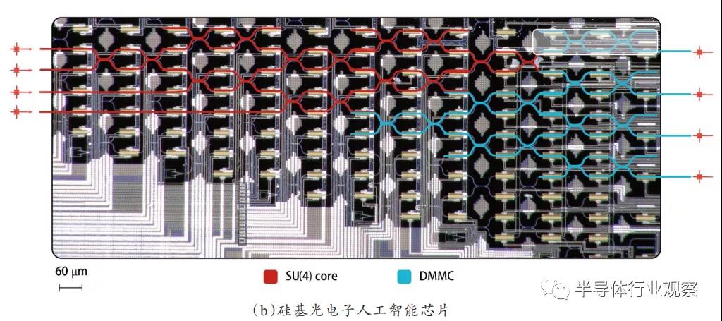 硅基光電子技術(shù)也獲得了高性能計算和人工智能領(lǐng)域的極大關(guān)注。在高性能計算領(lǐng)域,能耗和信息讀取速度成為制約高性能計算發(fā)展的兩大因素。按照現(xiàn)在技術(shù)發(fā)展,未來每秒進行百億億次數(shù)學(xué)運算的高性能計算系統(tǒng)全年用電量將達到40億千瓦時以上,同時在處理器和內(nèi)存之間、處理器之間的信息讀取速度嚴(yán)重滯后于處理器運算速度,導(dǎo)致處理器計算性能只能發(fā)揮至20%以下。受電子自身物理極限的制約,傳統(tǒng)減小芯片特征尺寸不能有效解決以上問題。與電子比較,光子具有傳輸速度高、可并行、帶寬大以及低功耗等特點,因此,利用硅基光電子芯片進行信息交互與計算是突破高性能計算發(fā)展展瓶頸的一個關(guān)鍵。2015年,加利福尼亞大學(xué)和麻省理工學(xué)院報道了首個光電一體處理器,邁出了硅基光電子技術(shù)在高性能計算領(lǐng)域應(yīng)用的第一步[49]。如圖8(a)[48]所示,基于硅基光電子技術(shù),在一塊芯片上同時制備了7千萬個微電子器件與850個電子器件,通過光子在計算和存儲單元之間進行了高速通信。在此基礎(chǔ)上,2018年又成功實現(xiàn)了10Gbps通信速度并融合了波分復(fù)用技術(shù)[7]。此外,硅基光電子技術(shù)也為人工智能領(lǐng)域提供了新的發(fā)展思路。利用光學(xué)結(jié)構(gòu)制備面向深度學(xué)習(xí)應(yīng)用的硅基光電子人工智能芯片于2017年被正式提出,有望實現(xiàn)高速、低能耗的推理和訓(xùn)練過程,如圖8(b)[50]所示。