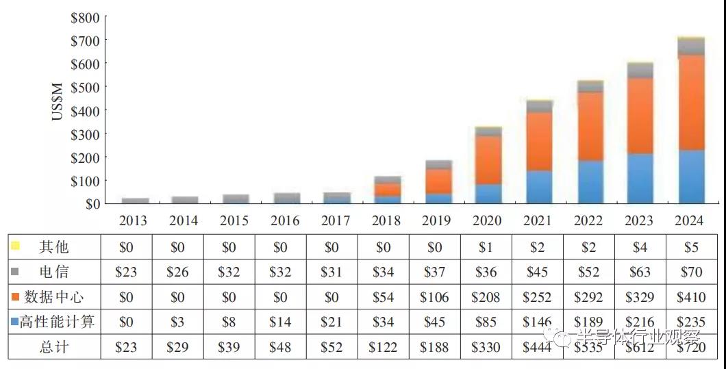 如上所述,硅基光電子技術(shù)在數(shù)據(jù)中心、通信、高性能計算和人工智能領(lǐng)域已經(jīng)彰顯出巨大應(yīng)用價值,其市場規(guī)模如圖9[51]所示,到2020年,總市場規(guī)模將達到3億美元以上。數(shù)據(jù)中心和通信將是硅基光電子技術(shù)應(yīng)用的核心應(yīng)用場景,但隨著高性能計算領(lǐng)域的瓶頸凸顯,硅基光電子在高性能計算領(lǐng)域的市場份額也將迅速增長。