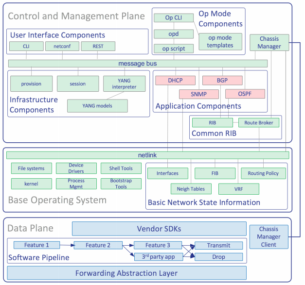 AT&T表示,其全球網(wǎng)絡(luò)包括來(lái)自供應(yīng)商的超過(guò)10萬(wàn)個(gè)互連的IP/MPLS路由器。這些OEM路由器是作為單片路由器平臺(tái)設(shè)計(jì),開(kāi)發(fā)和銷售的,具有垂直集成的專有硬件和軟件組件。但是AT&T的白盒應(yīng)用計(jì)劃將會(huì)脫離傳統(tǒng)的路由器,轉(zhuǎn)而采用白盒。DNOS白皮書(shū)以DPDK等軟件的發(fā)展和YANG模型的發(fā)展,以及商用芯片和可編程語(yǔ)言P4的發(fā)展,闡述了采用開(kāi)放軟硬件平臺(tái)的必要性,以及業(yè)界對(duì)標(biāo)準(zhǔn)的NOS的需求。