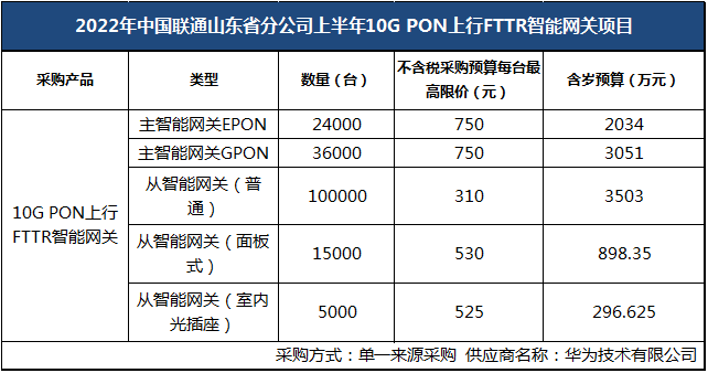 ICC訊 11月19日消息,山東聯(lián)通發(fā)布2022年上半年10G PON上行FTTR智能網(wǎng)關(guān)項(xiàng)目單一來(lái)源采購(gòu)公示項(xiàng)目,擬采購(gòu)各類(lèi)型10G PON上行FTTR智能網(wǎng)關(guān)合計(jì)18萬(wàn)臺(tái)。具體需求、最高限價(jià)和含稅預(yù)算如下: