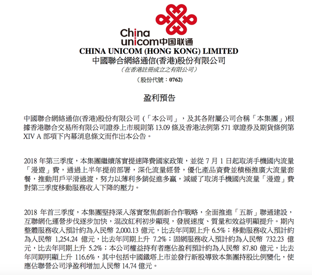 文章標題:中國聯(lián)通2018年前三季度業(yè)績預告:凈利87.8億 同比增長116.6%