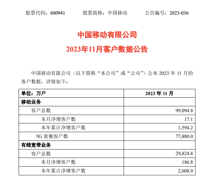 中國移動公布11月主要運(yùn)營數(shù)據(jù)