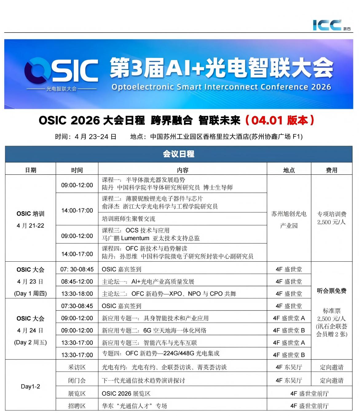 ICC訊 4 月 23–24 日 OSIC 2026 第3屆AI+光電智聯(lián)大會(huì)以“跨界融合?智聯(lián)未來”為主題,深挖OFC新趨勢(shì)、開拓光通信跨界新應(yīng)用,會(huì)議采用2(主論壇)+4(專題論壇)+N(閉門論壇、產(chǎn)品展、人才招聘展、休閑活動(dòng)等)會(huì)議模型,圍繞市場(chǎng)、技術(shù)、行業(yè)機(jī)會(huì)、人才四大維度展開,以AI算力光互聯(lián)為核心,延伸至6G空天地海一體化、車路云智能網(wǎng)聯(lián)、具身智能互聯(lián)等前沿領(lǐng)域與1500位與會(huì)嘉賓共同討論。