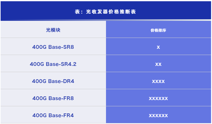 根據(jù)市場調(diào)研和各種收發(fā)器制造商提供的信息,同時參考了100G收發(fā)器的大致成本水平。根據(jù)推斷,當400G收發(fā)器達到市場成熟度時,其成本將比現(xiàn)在的100G收發(fā)器高出300%。400G收發(fā)器的定價可能隨市場容量及工藝水平的成熟而變化,故在本文中的推論僅做參考。